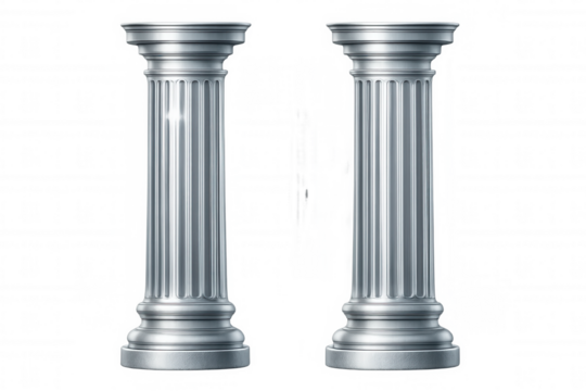 Two silver metallic columns standing on a transparent background, perfect for architectural visualizations or historical representations
