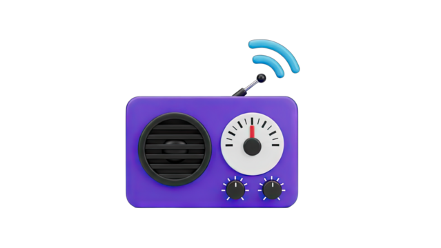 Retro Purple Portable Radio with Antenna and Signal Waves Transmitting Audio Waves on a Transparent Background 3D Render