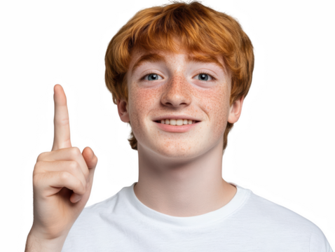 Young man pointing upward indoor studio portrait image bright environment engaging concept