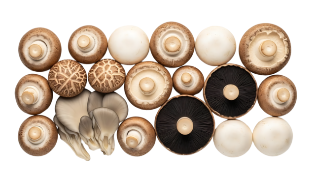 Variety of mushrooms showcasing different sizes, shapes, and textures, all arranged in an eye-catching pattern. Perfect for culinary enthusiasts and food-related projects.