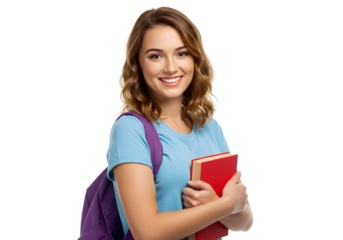 Smiling young female student holding a book, isolated on transparent background
