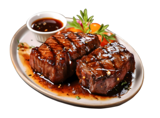 Grilled sliced Beef Steak with tomatoes and rosemary on a plate Isolated on transparent background top view