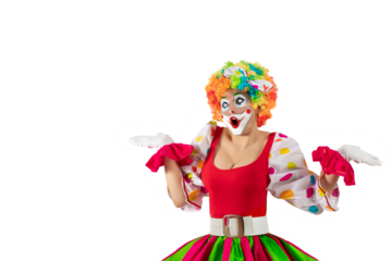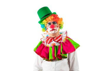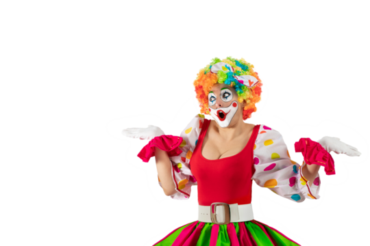 Funny clown. Entertainer Joker in colorful suit and wig. Buffoon with clown whiteface makeup. Trickster, jester, pantomime, mime. Professional actor at event, kids party, circus
