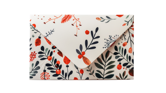 Colorful patterned card in open red envelope on transparent background
