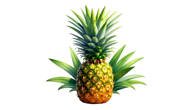 Ripe pineapple with spiky green crown and surrounding leaves, on a black background