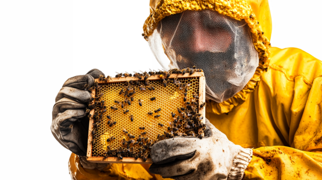 A beekeeper in a protective suit holding a honeycomb frame isolated on a transparent background