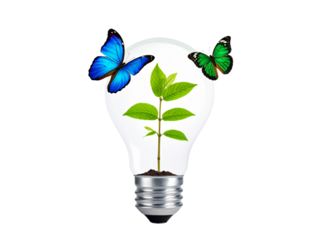 Green eco light bulb with leaves symbolizing energy, innovation and environmental growth isolated on white background
