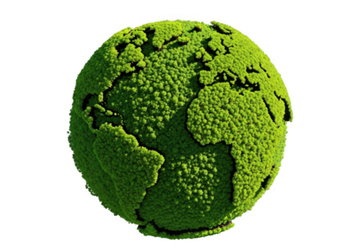 A vibrant green globe covered in lush vegetation, symbolizing environmentalism and ecological awareness, isolated on transparent background