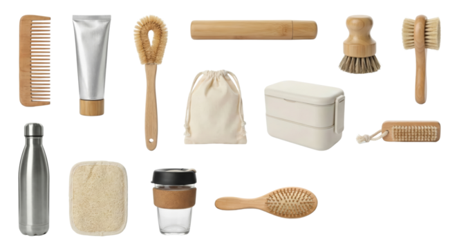 Collection of eco-friendly personal care and grooming items on isolated transparent background