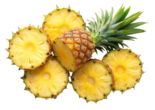 Closeup of sliced pineapple rings with green top on Trensprent  Background png