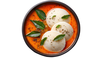 A plate of idli with a small bowl of red sauce and basil garnishings