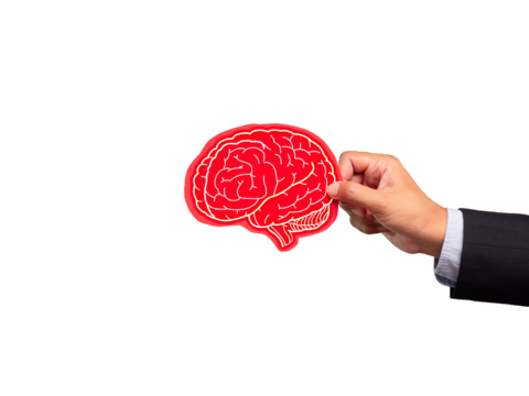 Close-up of hand holding a brain symbol made from red paper while standing on a transparent background.