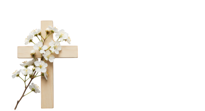 Wooden cross adorned with delicate white blossoms isolated on transparent background