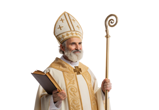 Bishop in ornate vestments holding crosier and book, isolated on a transparent background