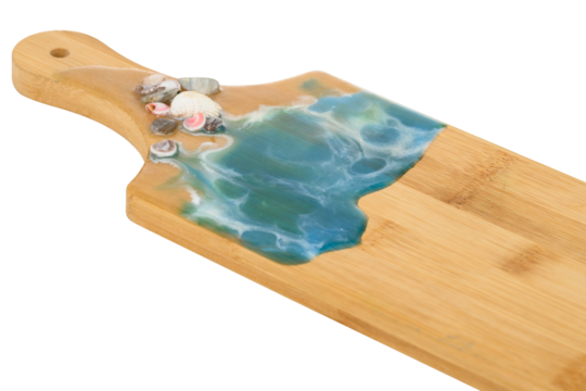marine decor made of epoxy resin on a wooden cutting board close-up