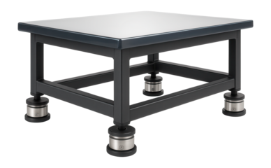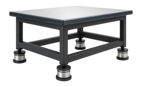 Vibration-damping table with an epoxy resin top and adjustable pneumatic isolators for precision machining workshops.