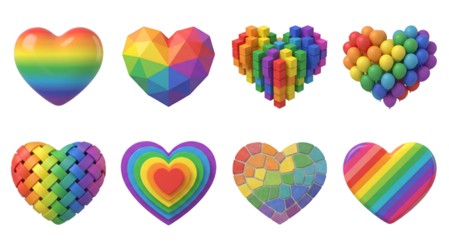 Colorful rainbow heart set including glossy, geometric, voxel, balloon, woven, and mosaic variants isolated. LGBTQ pride and love symbol collection.