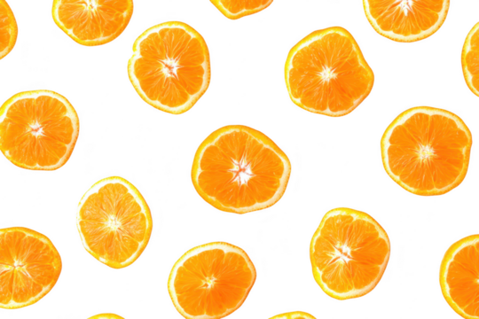 A arrangement of freshly sliced orange segments scattered evenly on a clean white background. their juicy texture and bright color. perfect for food photography or culinary use