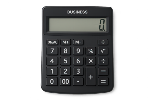A simple gray electronic office calculator with solar power isolated on a clean white background for business and financial calculations