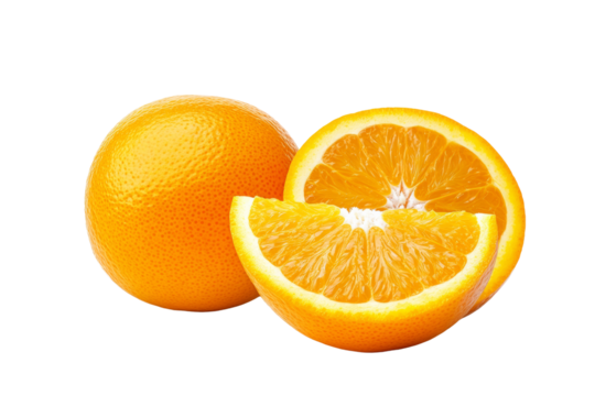Fresh oranges, whole and sliced, showcasing vibrant color and juicy texture against a white background.