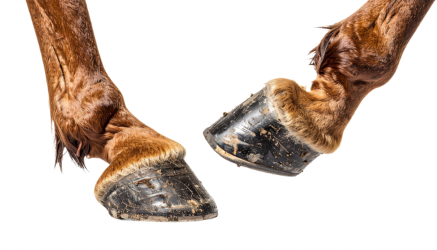 Close up shows the strength and elegance of brown horses hooves against a transparent background, showcasing equine details.