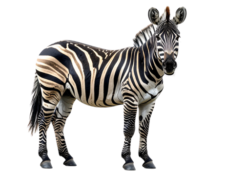 A striking full-body studio portrait of a zebra against a clean white background.