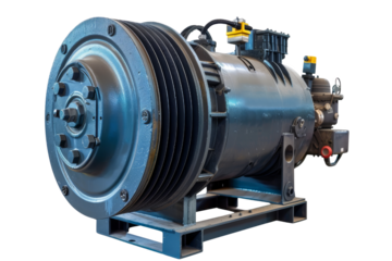 High-capacity industrial compressor on a steel stand, isolated on a white background. Ideal for engineering and industrial purposes.
