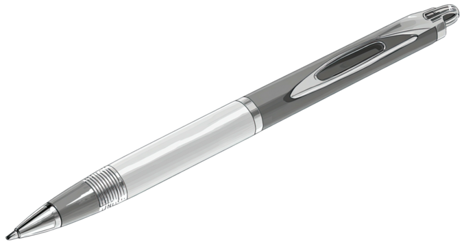 A monochrome illustration of a writing instrument, cylindrical body, tip, and accents
