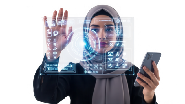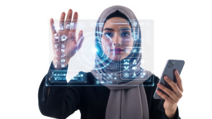 Woman in hijab interacting with futuristic digital interface on smartphone isolated on transparent background
