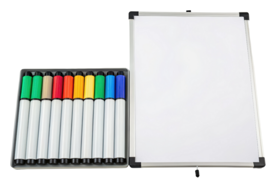 Small white magnetic dry erase board with a set of colorful markers isolated with transparent background