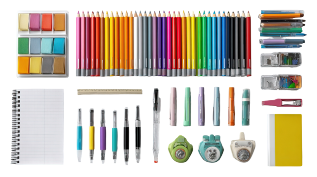 Assorted School Supplies Neatly Arranged on Transparent Background