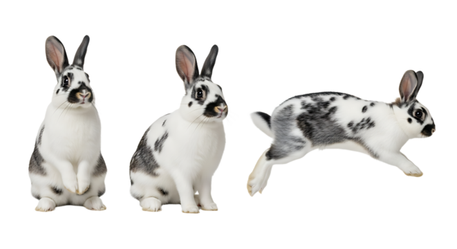 Three spotted rabbits standing sitting and leaping with ears erect.
