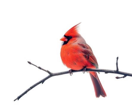 A vibrant red cardinal perched on a bare branch, its crest erect and beak slightly open, isolated on transparent background the birds bright color stands out sharply