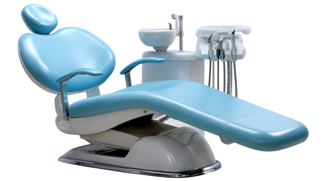 Dental Chair: A clean and modern dental chair, the central hub of a dentist's office. Features ergonomic design, tools and instruments.