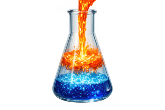 Erlenmeyer flask showing a vivid chemical reaction with hot orange liquid mixing into cool blue liquid, creating dynamic bubbles
