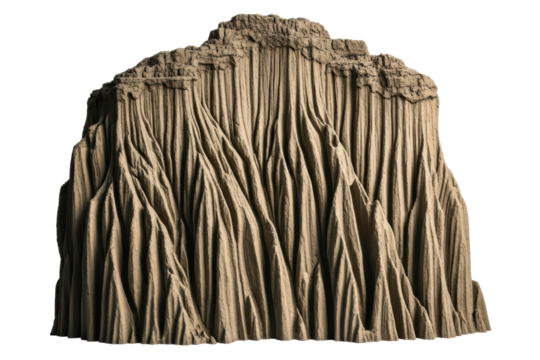 Textured beige sandy rock cliff formation with eroded surface details on a transparent background