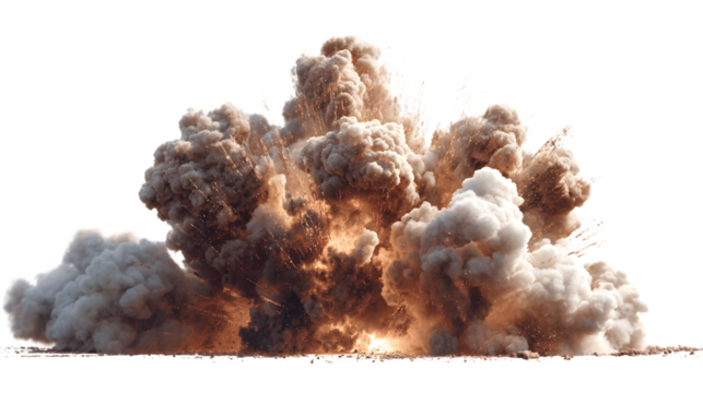 A dynamic illustration showing an explosion erupting upwards, with earth and dust