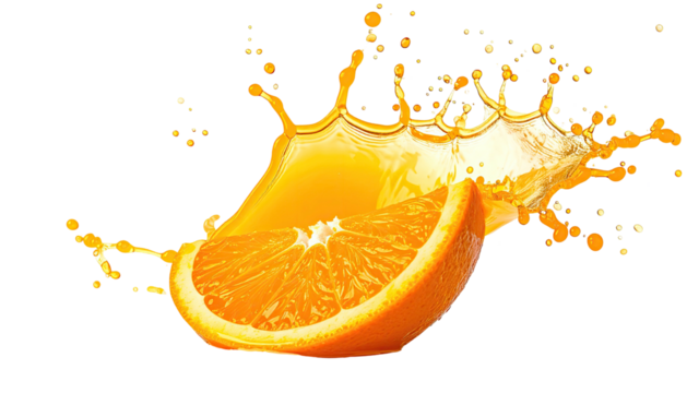 Vibrant orange slice erupting with juice, creating a dynamic splash effect against black