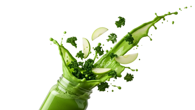 Vibrant splash of bright green kale and apple smoothie vigorously erupting from a clear glass jar creates dynamic health food imagery.