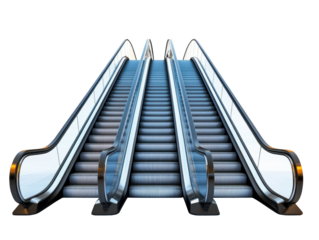 Two escalators side by side with yellow accents and black background in a studio shot isolated view on transparent background