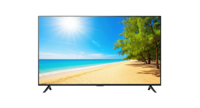 A sleek black flat-screen television centrally positioned, vividly displaying a high-definition tropical beach scene on a seamless transparent background, concept of digital escapism and tranquility
