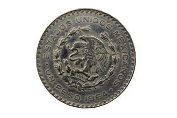 Anverso de la moneda de un peso de 1964, el escudo del águila devorando una serpiente, Estados Unidos Mexicanos