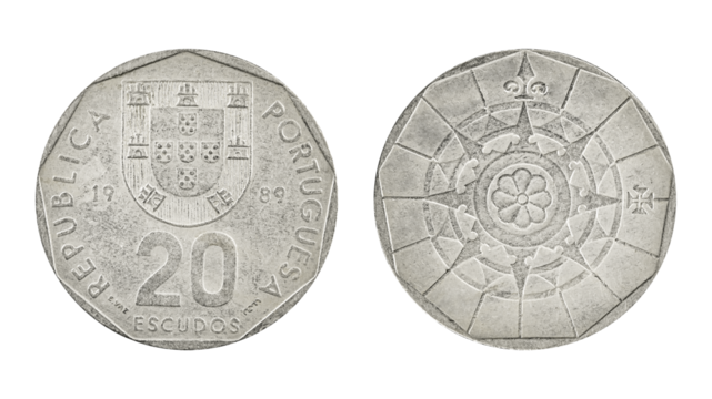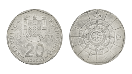 Vintage Portuguese 20 escudos coin from 1989, showing national coat of arms and intricate compass rose design, symbolizing Portugal’s heritage, currency history, and collectible numismatics.
