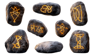 Set of Ancient Floating Rune Stones with Mysterious Ornaments Isolate on Transparent Background, cutout, png