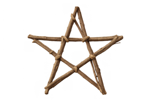 Handcrafted wooden pentagram star symbol representing pagan, wiccan, and occult concepts, having a rustic, natural design, isolated