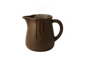 Brown earthenware jug with liquid dripping down its side, serving a drink, rustic ceramic kitchenware