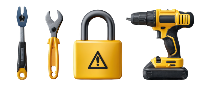 Adult caucasian hand gripping modern black and yellow cordless power drill, isolated on seamless transparent background, professional studio lighting. Concept of readiness and precision