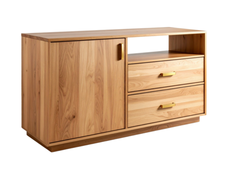 On a white background, an isolated wooden cabinet with drawers and golden handles, cut out