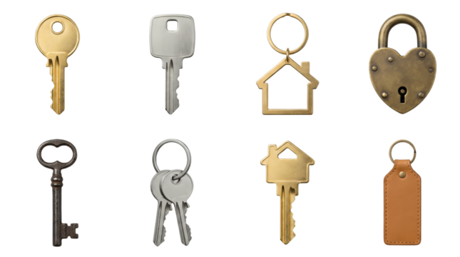 House key and padlock set including brass, silver, vintage, and heart shaped variants isolated. Home security and real estate accessory collection.