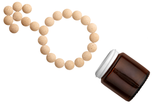 Medicine tablets shaped as gender symbol and medical glass bottle
